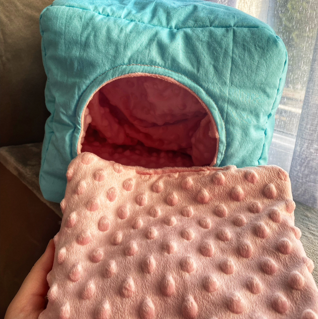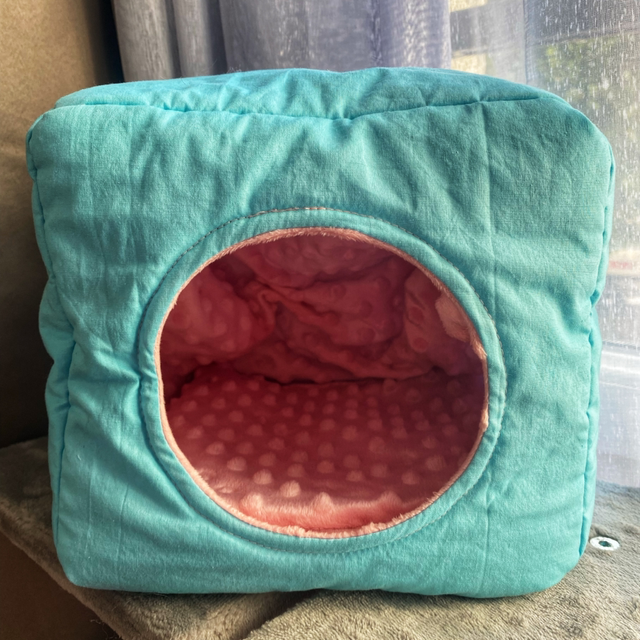 Un dodo cabane rose et bleu bien douillet pour que votre rongeur puisse se blottir et s’apaiser.
